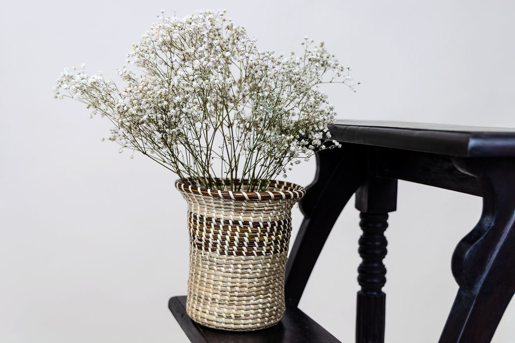 This exquisite flower vase exemplifies the perfect blend of traditional craftsmanship and modern design. Handwoven with a traditional winded stitch and complemented by a braided edge, this versatile basket can be used as a centerpiece or to hold flowers, bringing a touch of elegance to any setting.